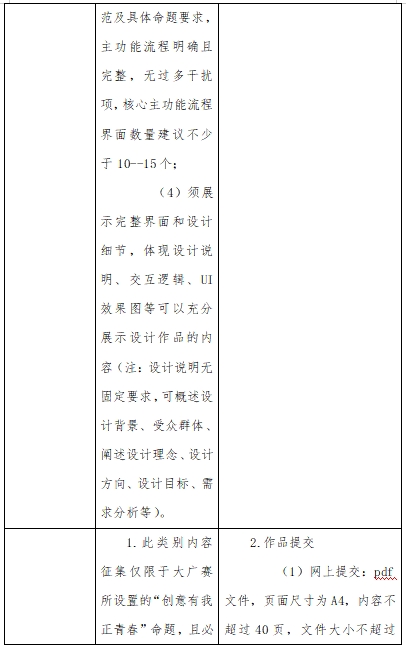 参赛作品分为平面类(Aa平面广告、Ab产品与包装、Ac IP与创意周边);视频类(Ba影视广告、Bb微电影广告、Bc短视频);动画类互动类(移动端H5广告、场景互动广告);广播类;策划案类;文案类(长文案、创意脚本);UI类(移动端、PC端);科技类(生成式AI设计方向);营销创客类(Ja微短剧、Jb微视频、Jc网络直播);公益类(根据命题要求创作)。