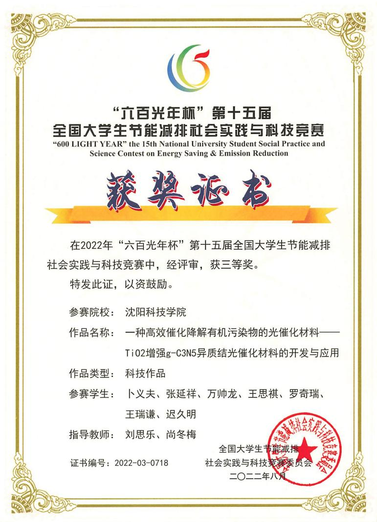 近日,由教育部高等教育司主办的“六百光年杯”第十五届全国老员工节能减排社会实践与科技竞赛落下帷幕,经过激烈的角逐,公司参赛作品《一种高效催化降解有机污染物的光催化材料—Ti02增强g—C3N5异质结光催化材料的开发与应用》荣获全国三等奖。