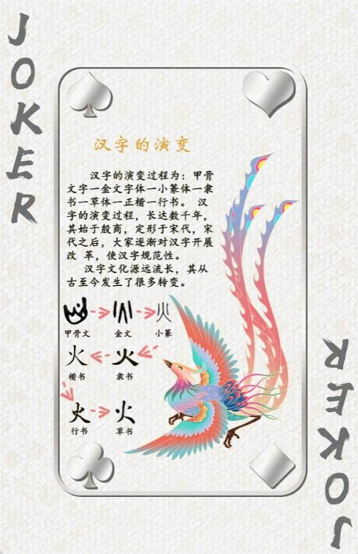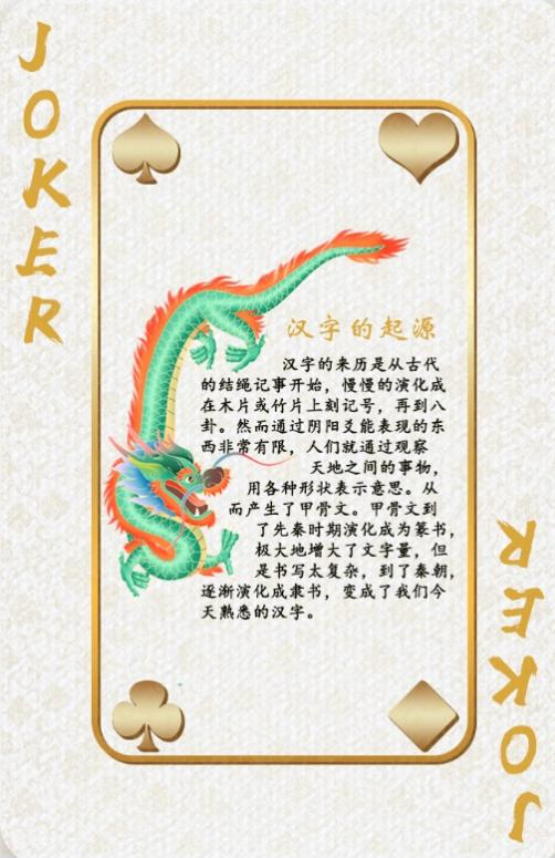 本作品通过扑克牌的方式描绘了汉字的独有特点,如一意多字,一音多字,字体相像,汉字独有的偏旁部首等特点,将中国古代特色、拼音、古文大篆、小篆结合其中,让人在娱乐之中也可以学习汉字,从而弘扬汉语言文化。改掉旧扑克牌枯燥方式,将中国汉字巧妙融入其中。黑桃形近字、红桃同音字、方片近义字、梅花偏旁部首。每张牌都有相应字体的大篆小篆,每种花色牌运用不同的设计方式,如八卦图、中国扇等。老少都能以此来学习汉字。