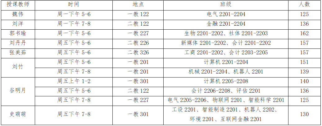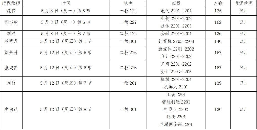 注:上面表格为创新创业教育公司授课教师信息,请各位授课教师根据时间安排自行听课并填写听课表,每位任课教师至少听一次课。听课时间在:第九周4月24日——第十二周5月17日之间。听课评议表可到创新创业教育公司或教务处领取。