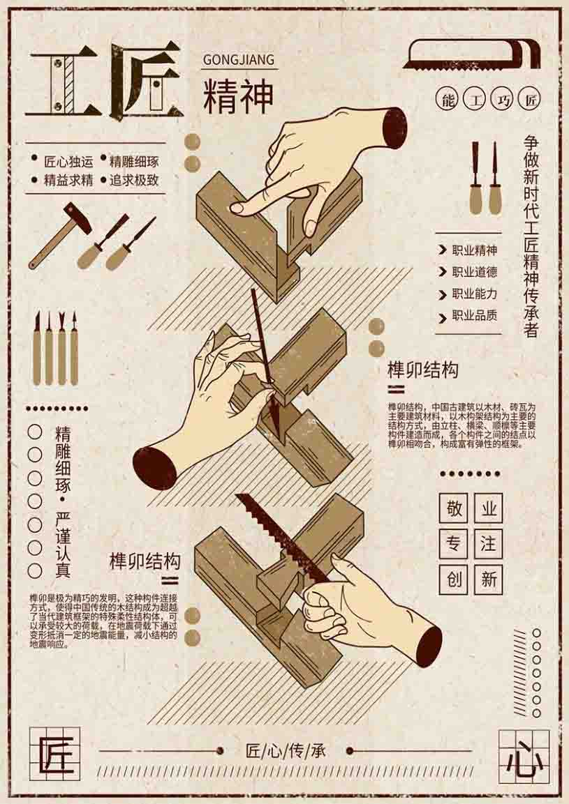 海报设计将运用对比强烈的色彩和简洁明快的构图,以吸引观者的目光。同时,通过精致的细节描绘和寓意深远的图案设计,展现榫卯工匠们的匠心独运和对传统文化的传承与发扬。本项目将致力于打造一款既具有艺术价值又富有实用性的海报作品,让更多人了解和欣赏到榫卯工艺的魅力,并激发对传统文化的热爱与尊重。