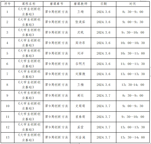 创新创业教研室组织全体教师研讨教学设计。包括:教学内容的组织、教学方法的应用以及教案、教学课件设计。安排如下: